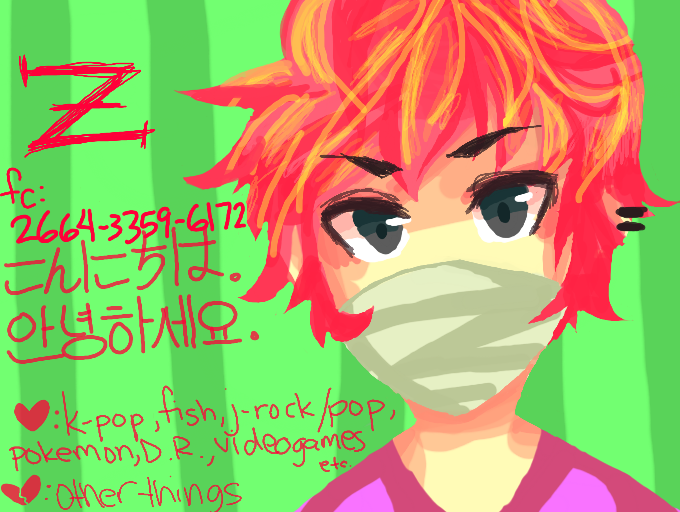oh! what a cute style! welcome to colors! and i have to say great choice of colors here :D i like how his face mask has a Z in it. cool. i like kpop too. gotta fav band?