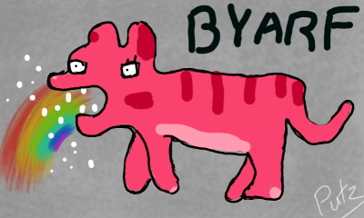 A kitteh from the indie game Techno Kitten Adventure. He propels himself backwards by throwing up rainbows.