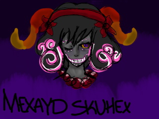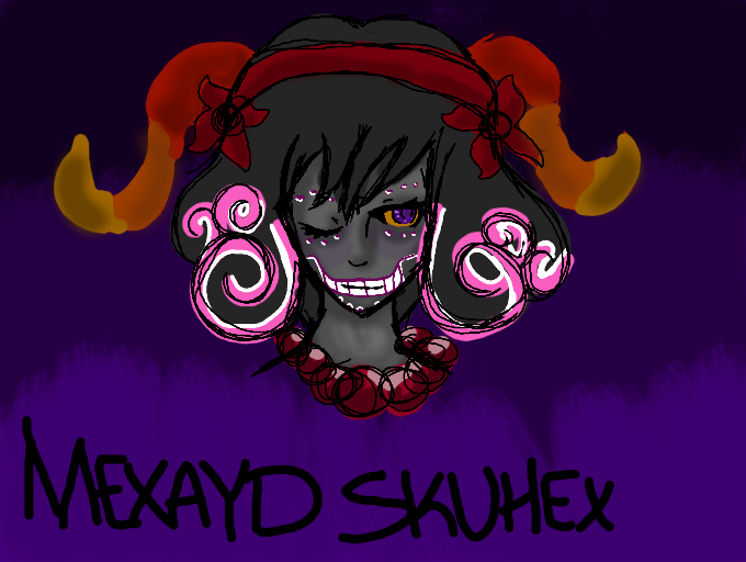 My Homestuck Subjugglator OC, Mexayd Skuhex. She is based off of Sugar Skulls and Jesters. Her lusus was a jester-like humanoid. She is 11 sweeps of age. SH3 TALKS LIK3 THIS and occasIonally, lIk3 thIs.