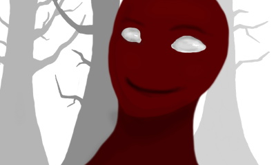He appears friendly at first, what with his endearing smile and comforting eyebrows, but the reason why he's red is because after he's killed his victims, he plays in their blood and washes in it. He also extracts the whites from peoples eyes and transfers them to his own face. The mouth and eyebrows? Eh, who knows. Maybe he draws them on with eyeliner.