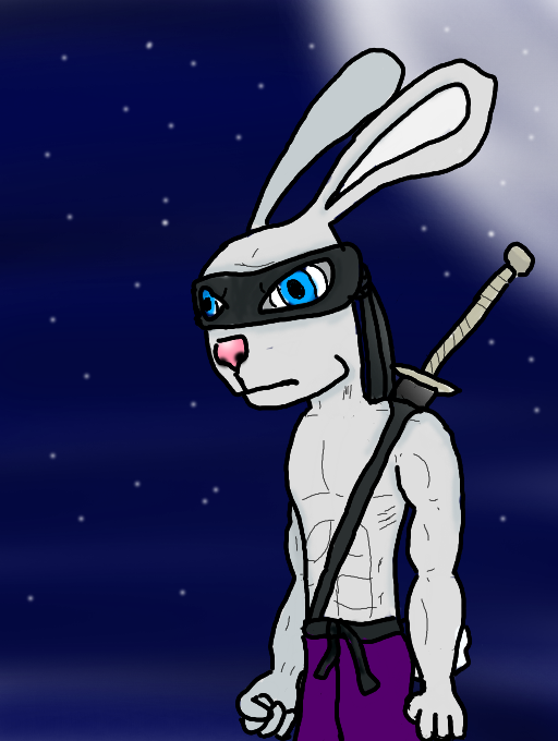 The Mighty Ninja Rabbit standing in the moonlight above his city