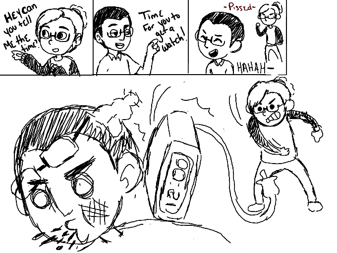 XD, "ouille!", :), Yes it's time to buy a watch! XD."Bing!" - "Ouch"Sorry, XD. :)