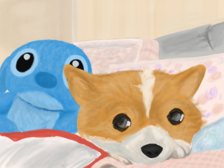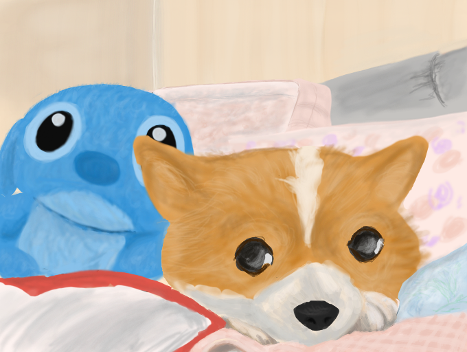 #dogしりあいのワンコ、すんげ~おとなしいのよね♪ディフォルメしすぎで、にてませんが!?(-_-,こものがおおすぎっ!まくらやらクッションやら、、、いちばんかくのがむずかしいのは スティッチのぬいぐるみだw