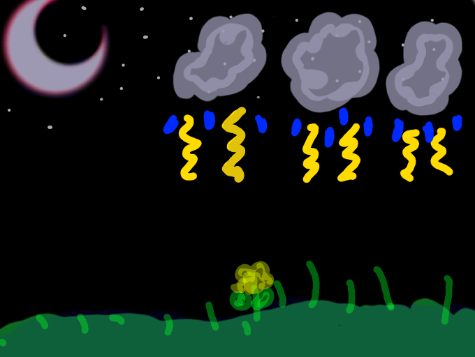Starry shimmery moonlit night with a thunderstorm happening.