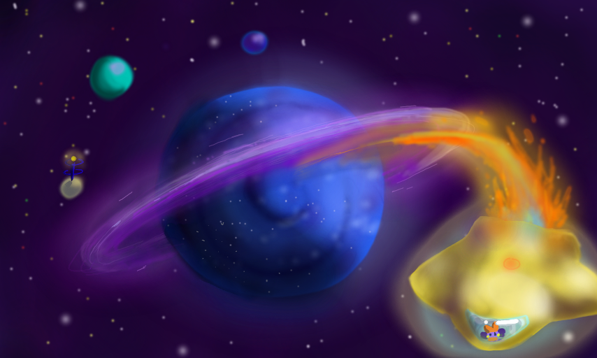 Tekray is an icy planet, with a solid outer core of rock and ice, with several tiny oceans. There is an inner layer of water under the crust, where the Tekran fish all live. The ground is icy blue, the clouds form a giant swirl when seen from a distance, and it's surrounded by purple and white rings. Tekray has 3 moons, and the Teklings use the smallest one as a communication center with other planets, and planted a massive antenna on it. And lastly, the ShootingStarship! Can you see the driver?