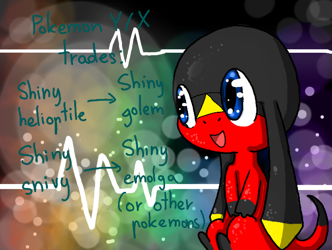 Someone wants to trade with me in pokemon?I want:Shiny helioptile,shiny snivySome of my pokemons:Shiny golem,shiny emolga,(and more!)