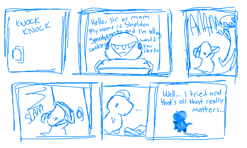 My fav. panel is the one in the top right corner with him holding the box-o-cookies. :3
