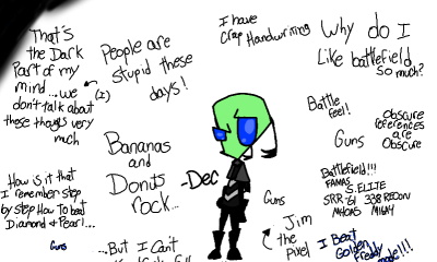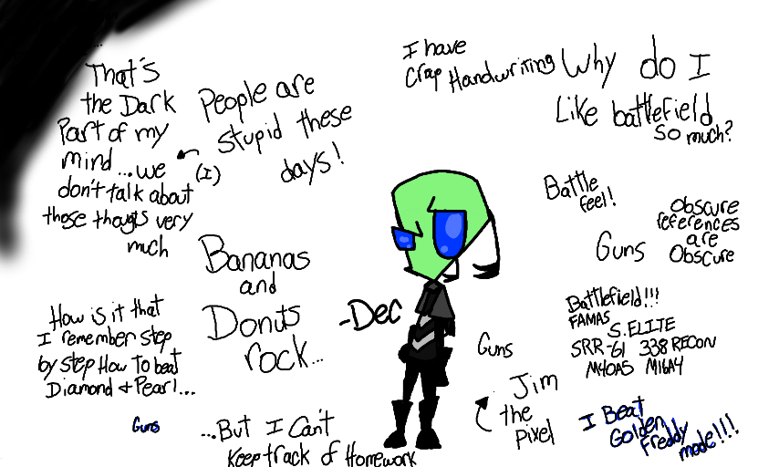 those words that're floating and you're reading are literally just thoughts i threw onto the page...screen, thing. and as for Dec [the stupid irken there in tne middle] I decided to go back to the way Dec used to look...when I originally made him he looked like that so...yeah...that is all