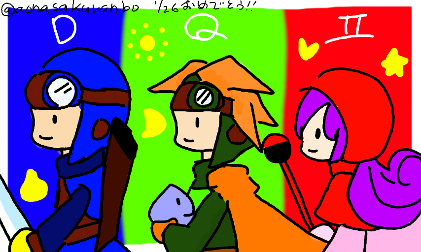 #dq ワンドロ。30ぷんかんがえて、30ぷんでかいた。いろいろきまらなくてぶなんなこれに。はいけいはちずのつもりだった……とにかくおめでとう!!