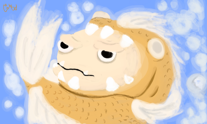 Quick painting to get through these Mon-mornin' pains. I've recently had a vivid dream of a dead pet fish just floatn' around there with dead eyes, yeah. I woke up too early this morn w/ a large black ant crawln' in my bed too. Now that's bad enough. :/