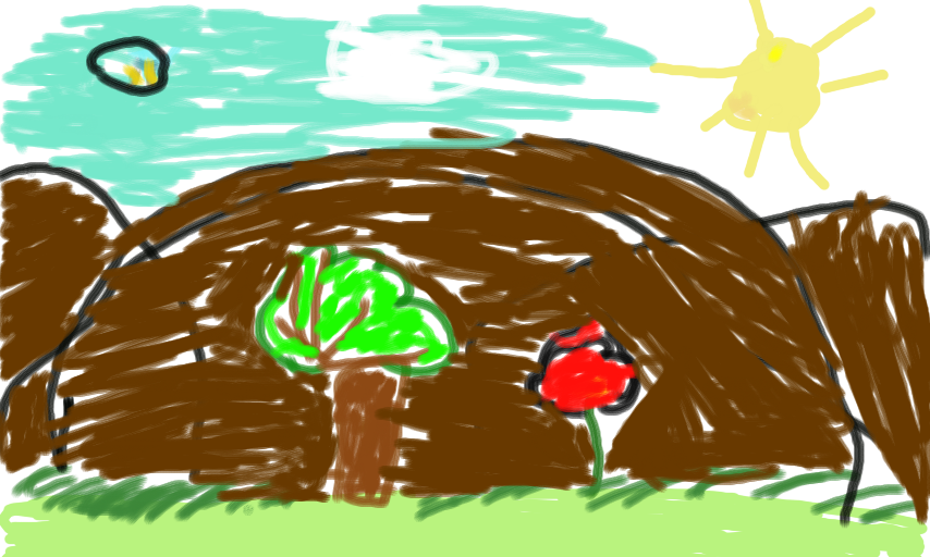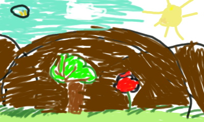 Vorne eine Weide mit einem Baum und eine Blume,im Hintergrund ein Gebierge