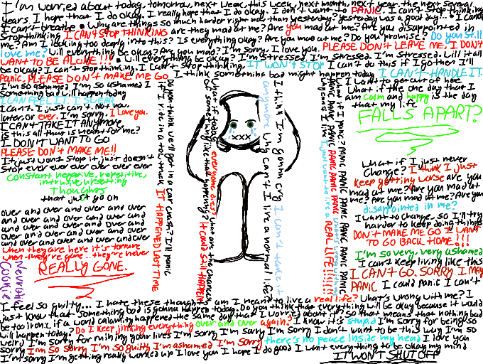 I have Anxiety, OCD, Agoraphobia and Panic Disorder. This is a very personal picture, as it shows what can and will run through my head -- mostly on my bad days. It also represents how I feel about these thoughts. They make me stressed and miserable, and keep me from living any sort of life or doing the things that I want to do.