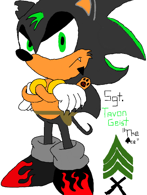 This is my OC. His name is Tavon 'Ace' Geist. His nickname is Ace because that is how you say gun/pistol in Finnish. This is how I imagined Tavon as a hedgehog. He has the ability to pass through solid objects, and can turn invisible temporarily. He's usually a quiet, thoughtful person. Not the intimidating type though. His father was a Marine, but was also a very thoughtful person. He inherited his powers from his mother's side of the family. At around 19, Tavon joined the Marines, too.