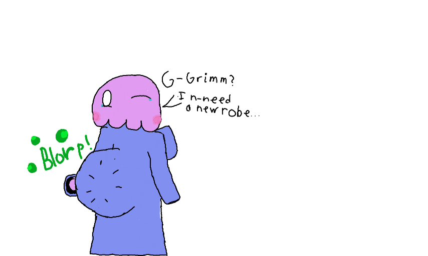 A drawing of a little mind flayer calling to his servant for some new clothing, presumably because his current garment is strangely tight. :]. I don't know what to name this little guy, but I've taken a liking to him.