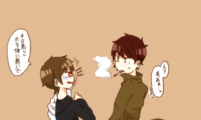 は や い(かくしん)イライラしてるイケメンがタバコすってんのいいとおもうの!どこみてるかわかんないはんめ!きむずかしげなまゆげ!ちょっとひらいたせいてきなくち!んでたまにおもいだしてまゆひそめてしたうちしてたりしてな!おまいはキヨさんにかさねるとわかりやすいとおもうよ!