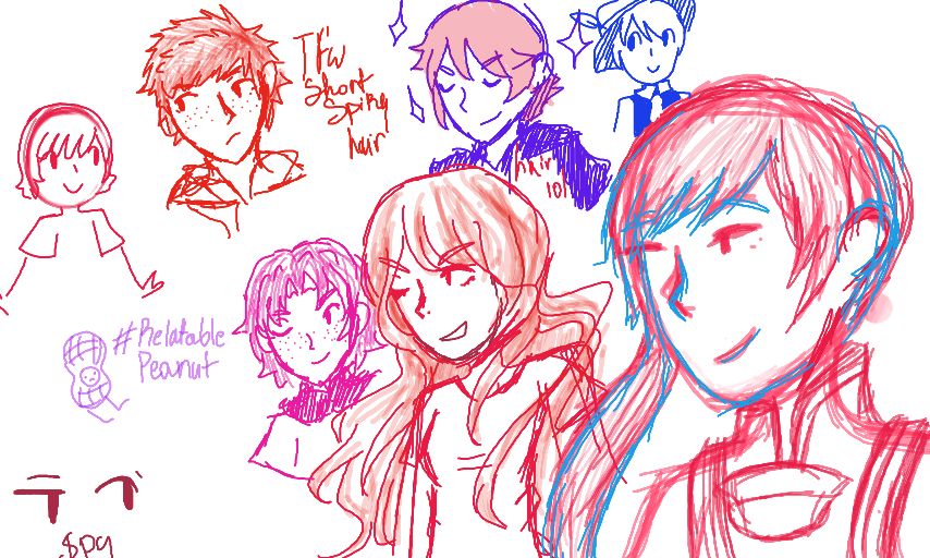 Me trying new things (angles, hair) or just plain old doodling.The doodle in fuchsia/hot pink has to be my favorite (the one to the right of relatable peanut)