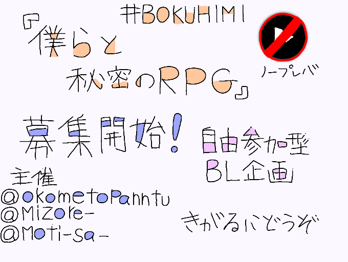 たいへんながらくおまたせいたしました。「ぼくらとひみつのRPG」ぼしゅうかいしでございます。もちろんいましったかたでも、さんかかのうです。しめきりは、まだみていですので、あせらないでけっこうです。たくさんのおうぼおまちしております。