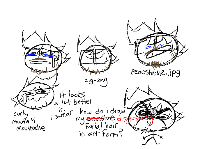 the closest i've gotten to actually drawing my facial hair is like three lines on the bottom of a circle when in actuality i have like a full beard/goatee and a moustache