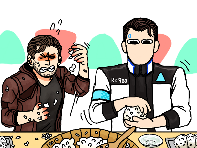 【ZORCHさん】カーラがにぎると ちゃんとこどもサイズでたべやすいおおきさにしてくれそうですね~!ギャビンは……。( ´^^` )°。コナーのにぎったオニギリはハンクサイズのとりあえず どでかいのになってそうです~! ( °^∀^)⊃△(からだのサイズにあっていればいいとおもっていそう…)