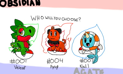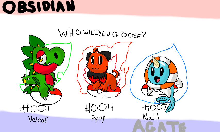 In my fangames, POKEMON OBSIDIAN and POKEMON AGATE, these are the starters. Comment who you'll chose! I love Nalil.