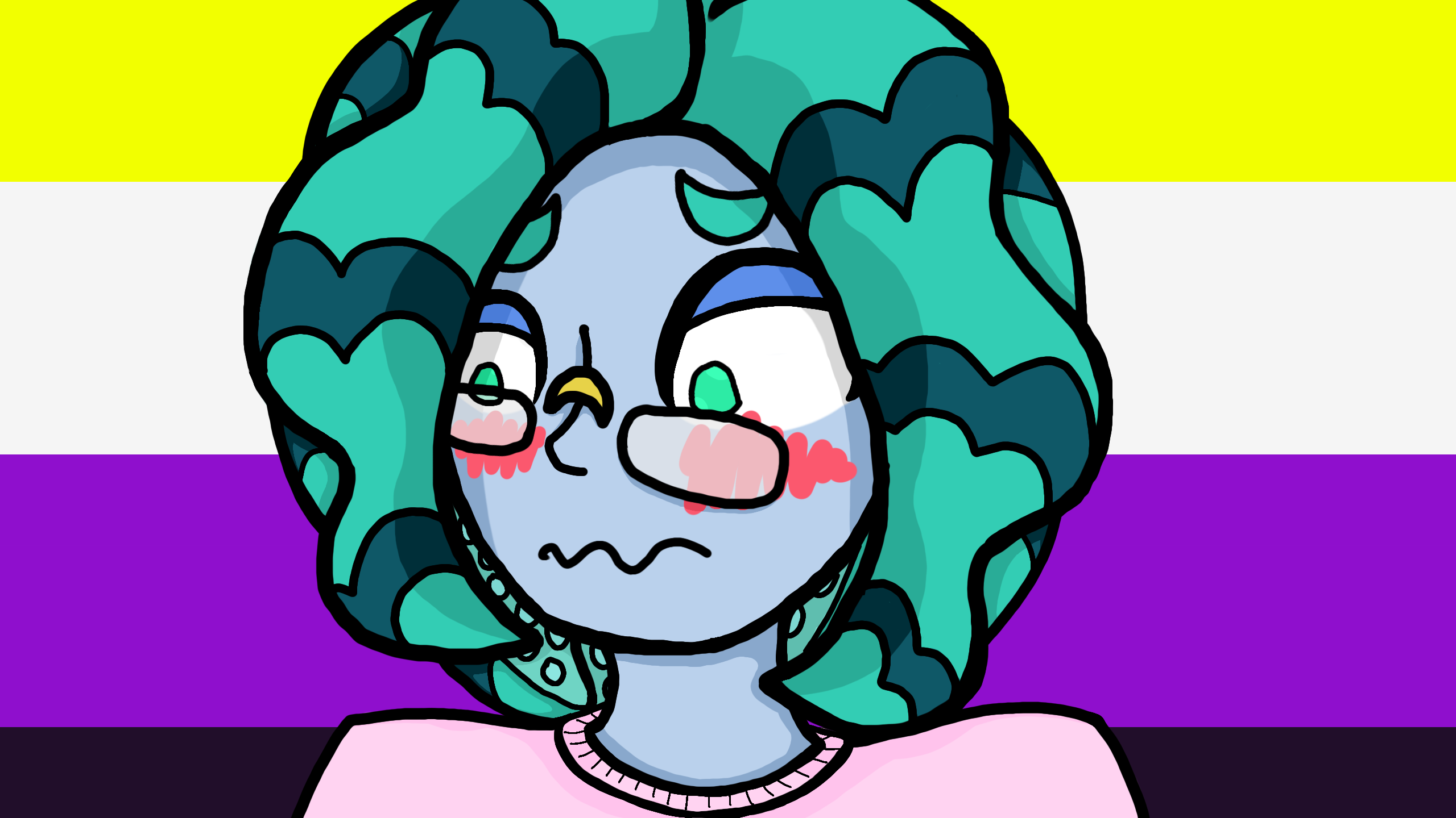 Hi, this is my first real piece of work on colors! I drew my fursona, who's an octopus. Believe it or not, I came up with this design before I saw Octolings... Anyways, like myself, my sona is non-binary and a lesbian! Unlike myself though, who uses he/they/she pronouns, my sona uses just he/they. Have a good day and thank you for reading!