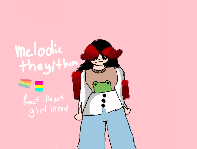 Melodie / Mel / Melo / rawrrthey/themage:14Gay / Pansexual/ non binaryfact: lisent girl in red and have a frog like pet in her houseDream pet : Axolot