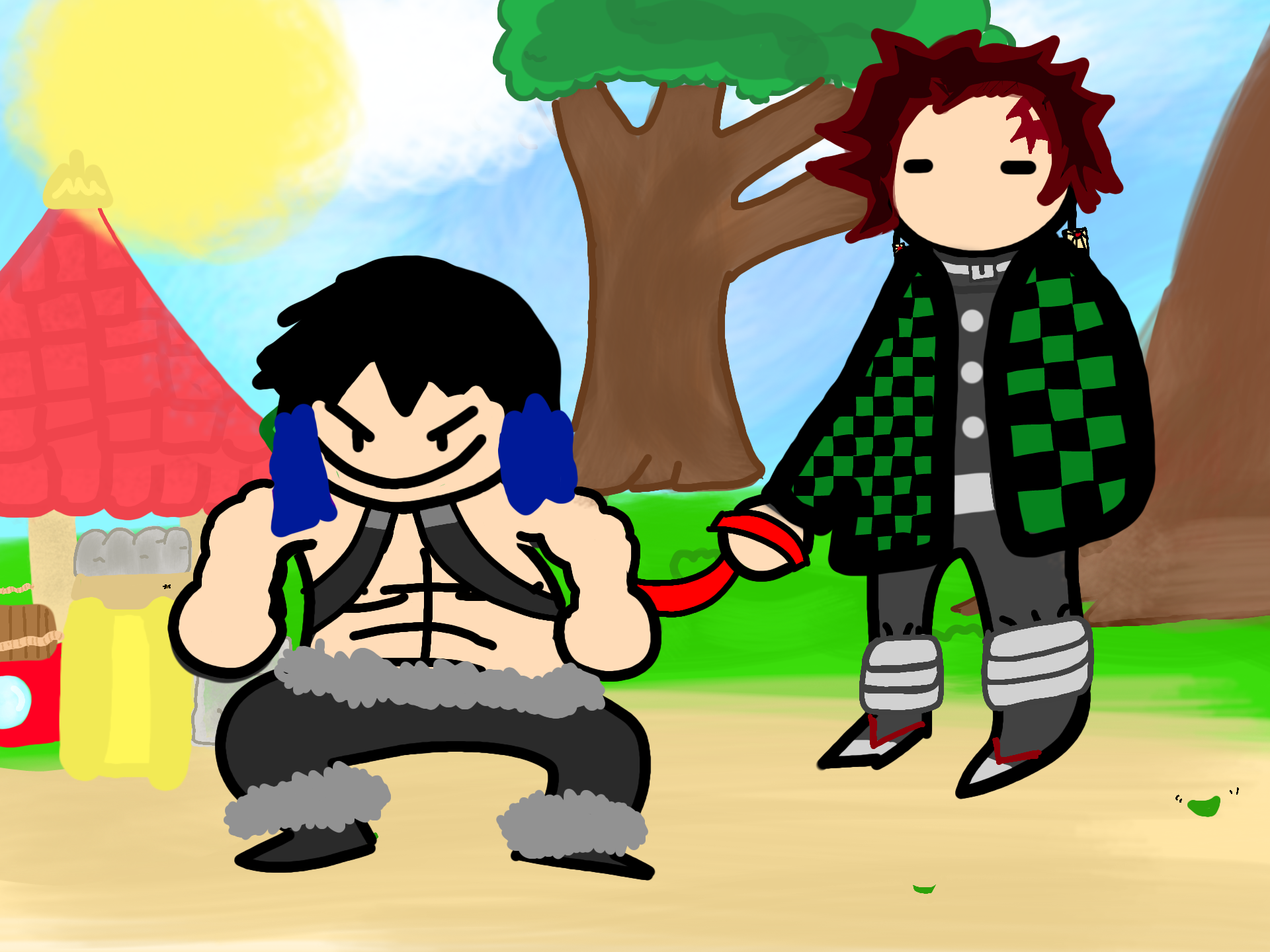Tanjiro trying to control Inosuke. lol i feel like they would be strolling through the park and see a dog and Inosuke would yell" TANJIRO theres a demon!" And pull out his katona and start yelling and trying to swing at it. LOL anyways I kinda liked the drawing before the background