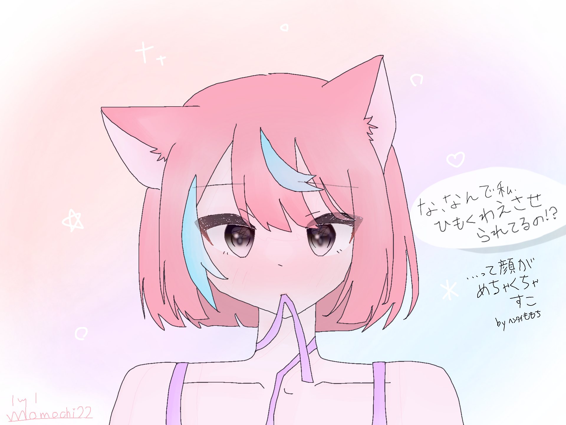 うわぁ……!!!可愛すぎるよぉ…!!せんぱぁぁい!!先輩カラーでげきかわだし目がめちゃくちゃキレイでもうびっくりした!wそうなんだよなんで紐食わせたんだろうね…つむぎもよくわかってないんだよね…()背景もゆるふわで可愛いし…とにかく先輩の絵の強みは塗りなんだよ……(もちろん線画とか構図も神ってるよ!?!?)つむぎの線画を大好きな先輩の塗り方で塗ってもらえて幸せだあ……長文ごめんね〜!それほどに良かったんだよ……