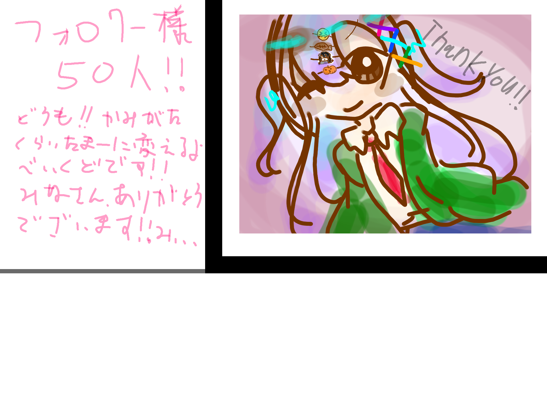 50人おめでとうございます!これからも活動頑張ってください!リクエストは...自分の代理お願いできないですか? #天世 描いてくれたら跳び跳ねます(^^