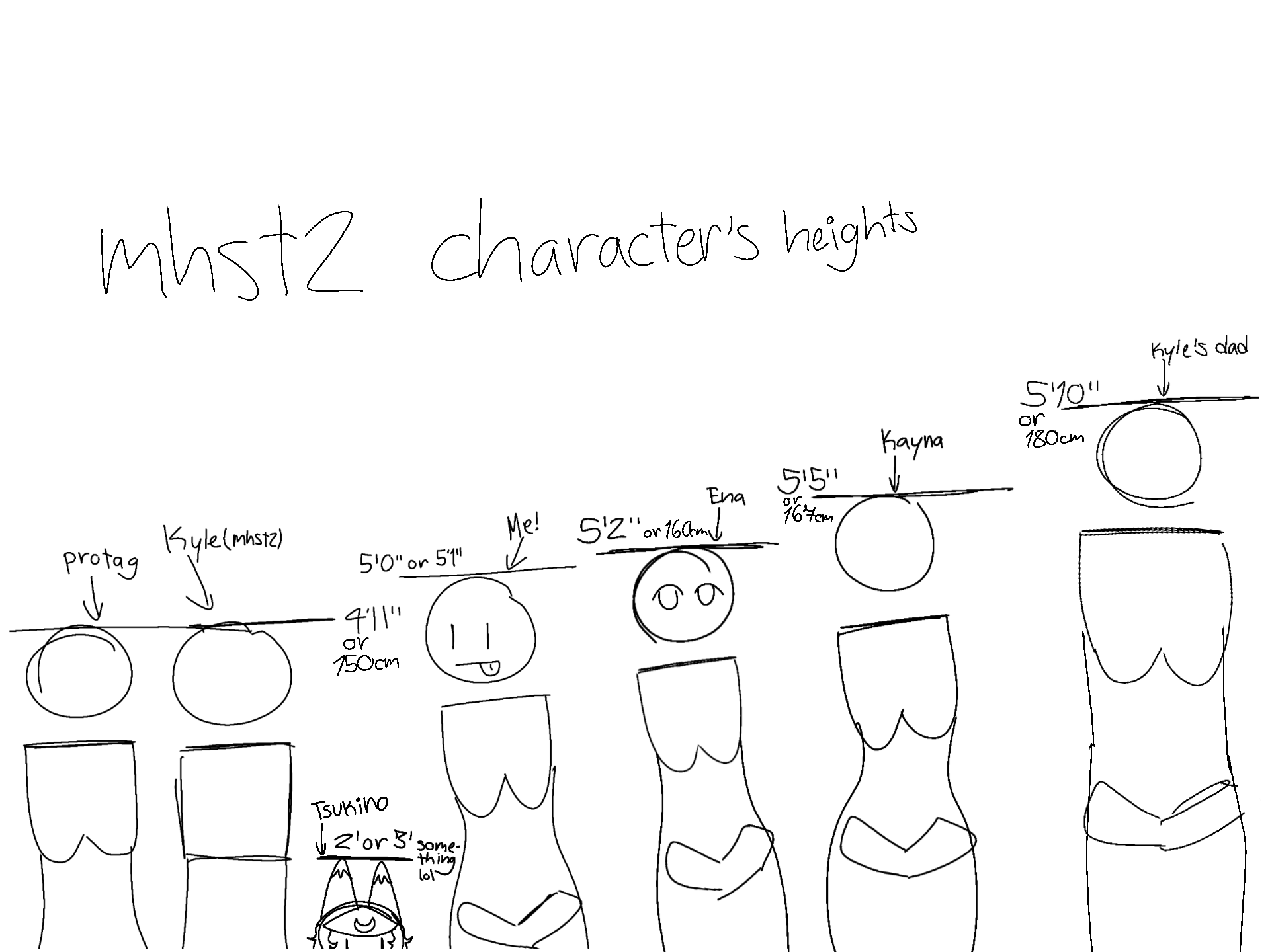 Not a headcannon I looked through the mhst2 artbook and it says some of the characters' heights, like how the protagonist and Kyle are 4'11" (shorter than me) I expected them to be at least like 5'3" or something. And it says Ena's height, Kayna's height, and Kyle's dad's height. I'm just assuming that Tsukino is like around 2' or 3'