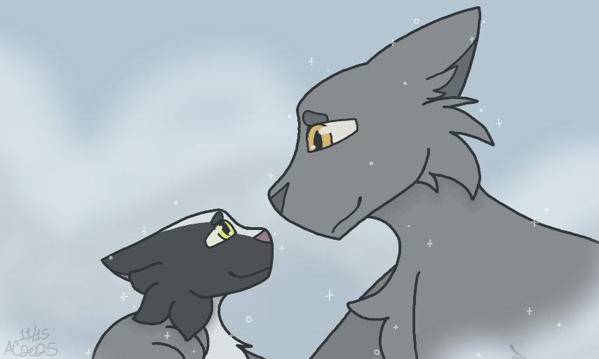The first drawing I posted to this site, on November fifteenth 2015, was of Flintfang and Badgerfang. I redrew it again three years later, of Badgerfang's death scene. Now, I draw them at peace. Together in StarClan, never to see harm come their way again. It's beautiful progression, I think. It feels like a slight parallel to myself and my journey, in its own way.