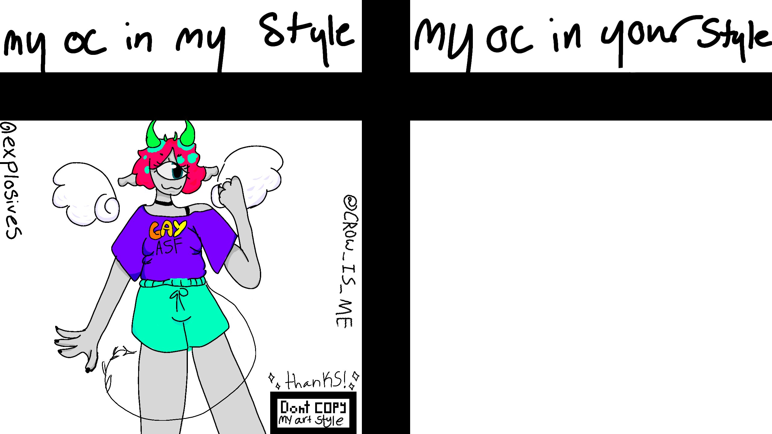 this is crow you can do any pose and any hair color because they dye there hair also any cloths. i can not wait to see your art slyles and my oc love u all!