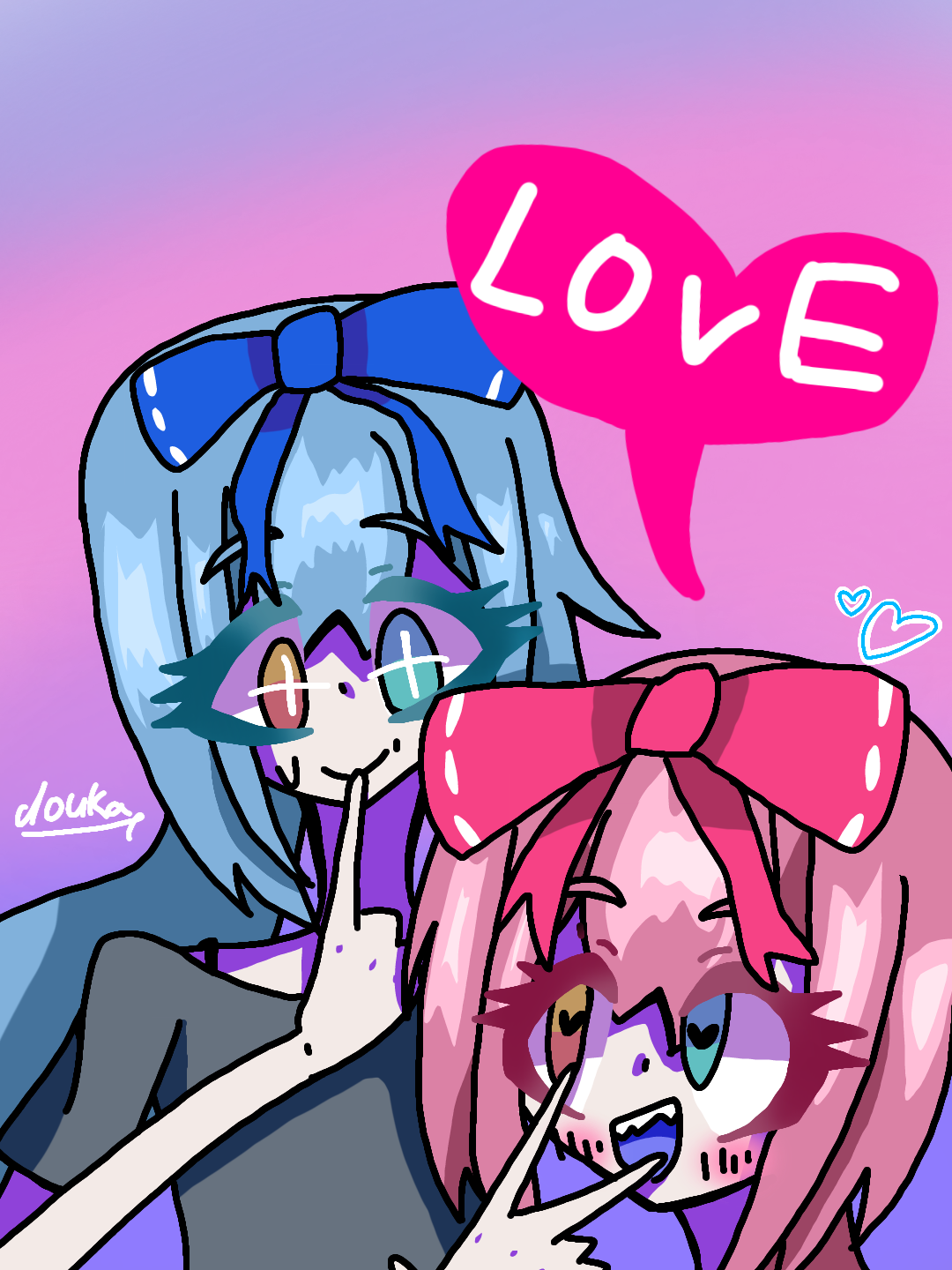 青色の子が姉、ピンクの子が妹ナノ。妹は姉への愛強すぎるLOVEのLが隠れていたので再投稿しました。 #イラスト #irasuto