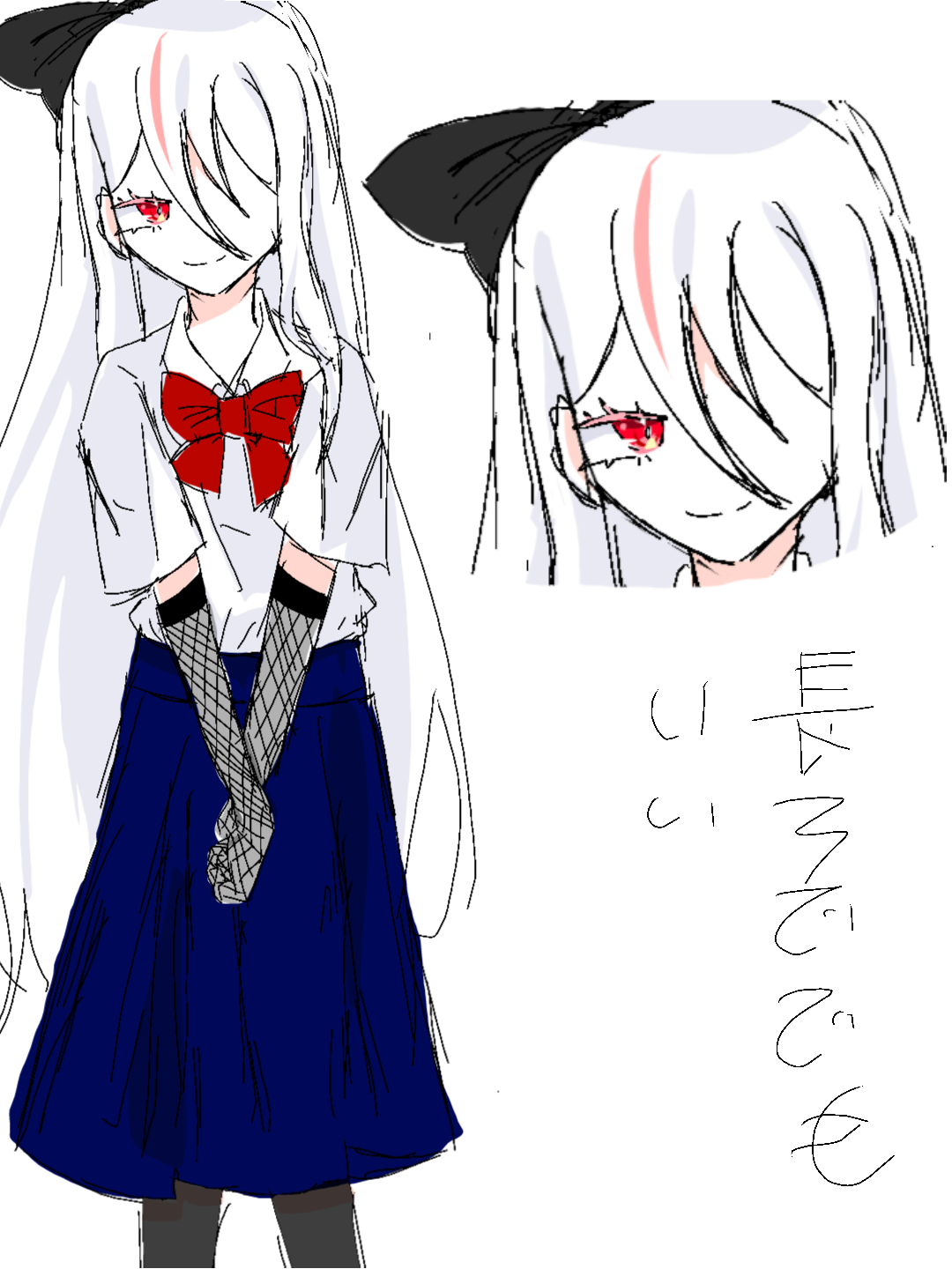 特徴↓黒リボン 半袖(長袖可)長袖にするんだったら袖めくりで何か手に編み手袋着けてる長スカート 黒タイツ白髪 赤メッシュ 赤まつげ赤目 前髪二本 親が過保護露出が少ない 海泳いだ事ない!!【追記】166cm 44キロ @-YamadaYuzu-分かりにくかったら言ってね(ペン買ったら描きます) #KR_oc #資料共