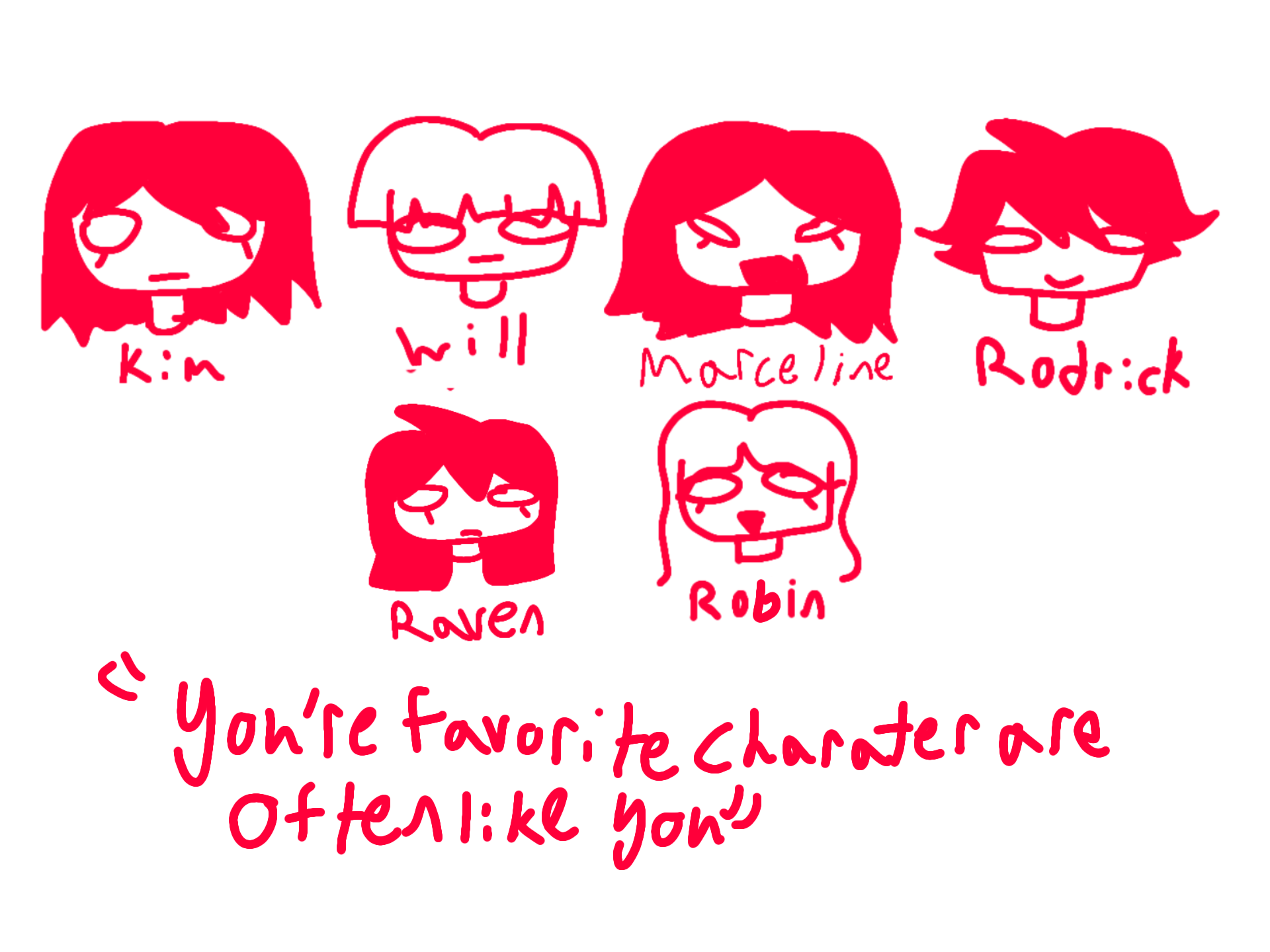 1.) Kim pines scott pilgrim 2.) Will Byers Stranger Things 3.) Marceline Adventure Time 4.) Rodrick Heffley Dairy Of A Wimpy Kid 5.) Raven Teen Titans 6.) Robin Stranger things