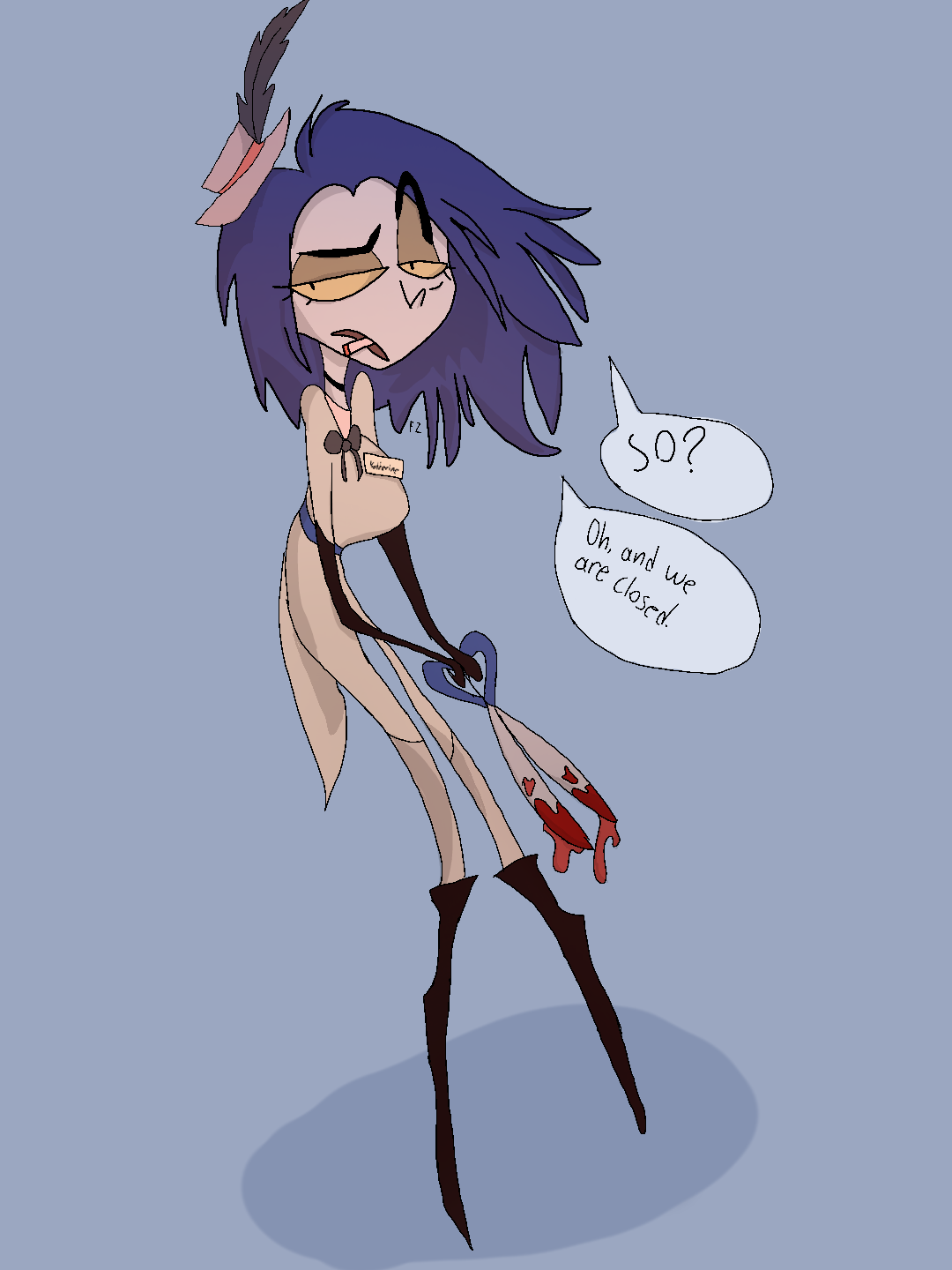 She goes by Vj for no reason, but nobody calls her that. Shes a museum worker with anger issues that got sick of her job.