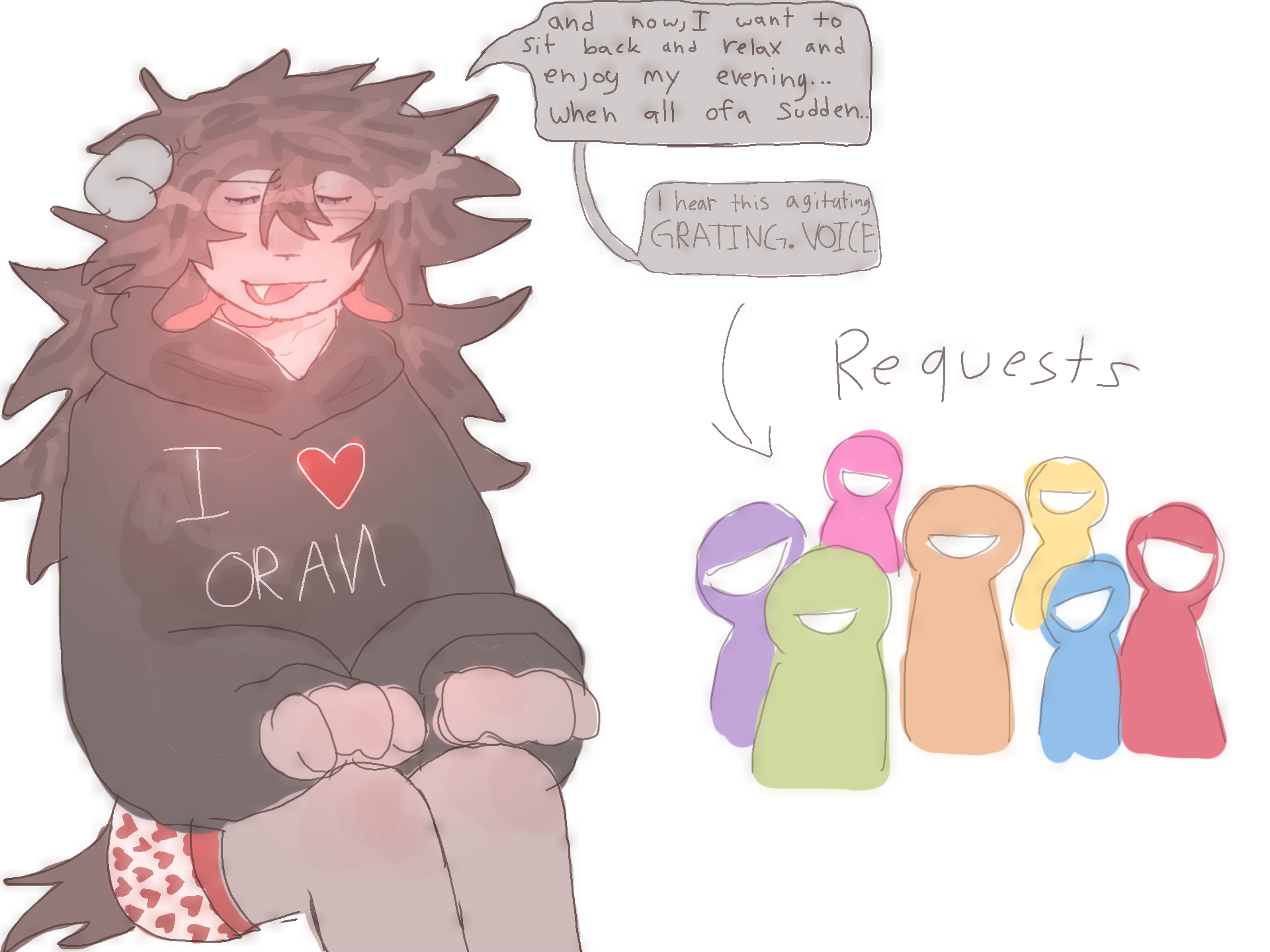 ok, i am open to do rq's and i LOVE doing them for ppl, but my pet peeve is when some one who asks for a rq nags you that u haven't done it and is upet that im doing other ones and not theirs. ok i understand that if someone tells you their gonna draw something for you and they take like 3 weeks then u can nag about it but bfr cut me some slack, im hella sick, and in the last 9 posts ive done only 3 are not rq's i do not rq ones in the middle of a bunch of rq's to keep my sanity. so please