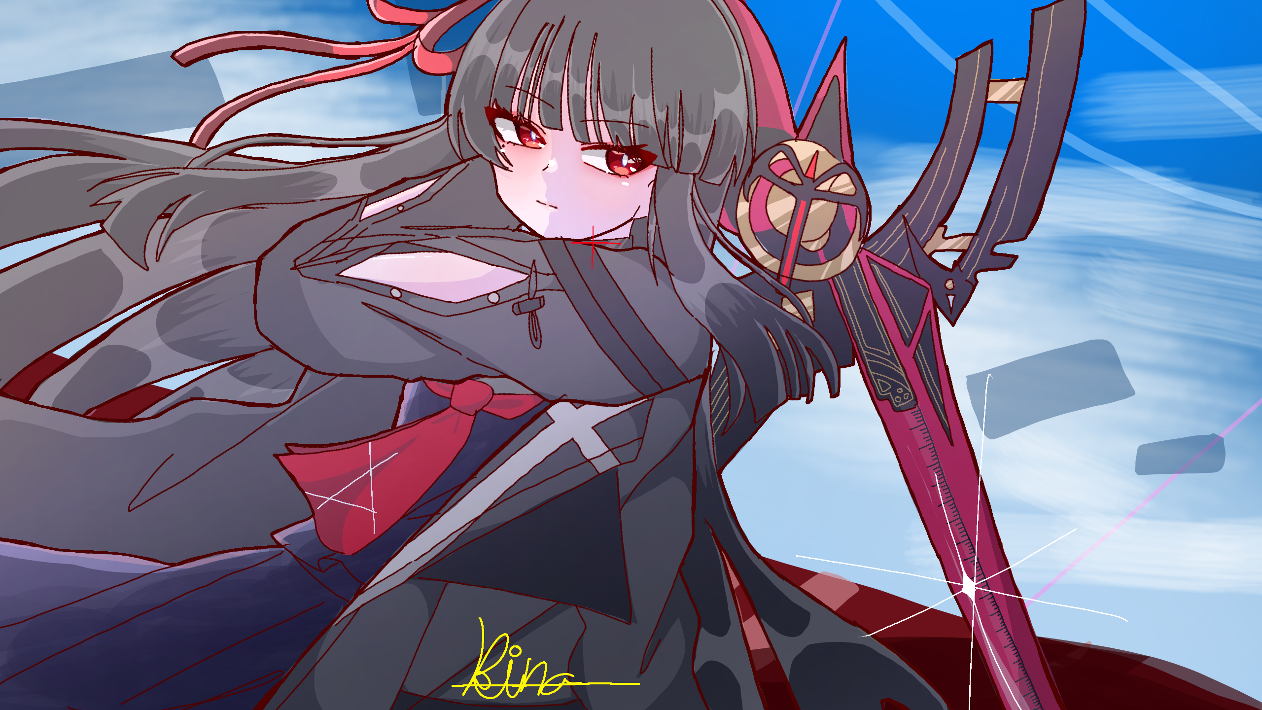 凄くかっこいいです!特に表情や武器の光ってるところの表現とかがかっこいいです!背景の空綺麗すぎて昇天しました。(関係なくて申し訳ございません