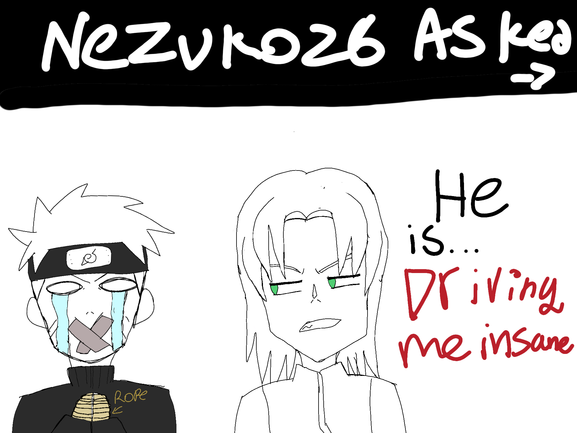 @nezuko26 asked: sakura is naruto driving you insane? Sakura:he is... driving me insane naruto: *muffled screaming* #askanarutocharacter