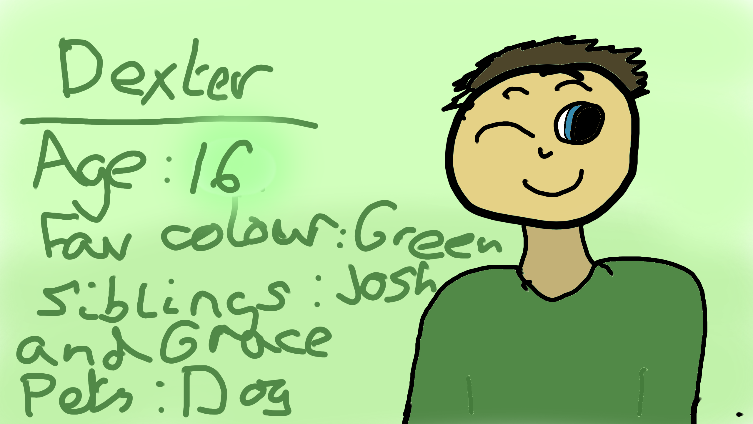 He is very smart and funny. He has a girlfriend called Stella. His dog is called Lucas. His youngest sibling, Grace is 7 and his brother, Josh is 12.