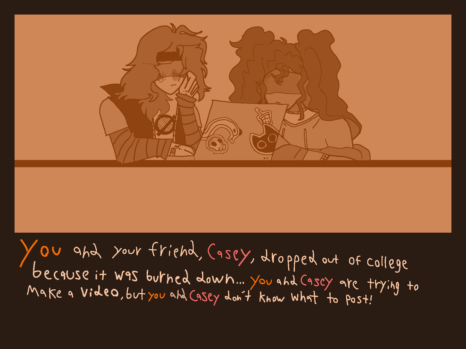 You and your friend, Casey, dropped out from College because it was burned down... You and Casey are trying to make a video, but you and Casey don't know what to post!