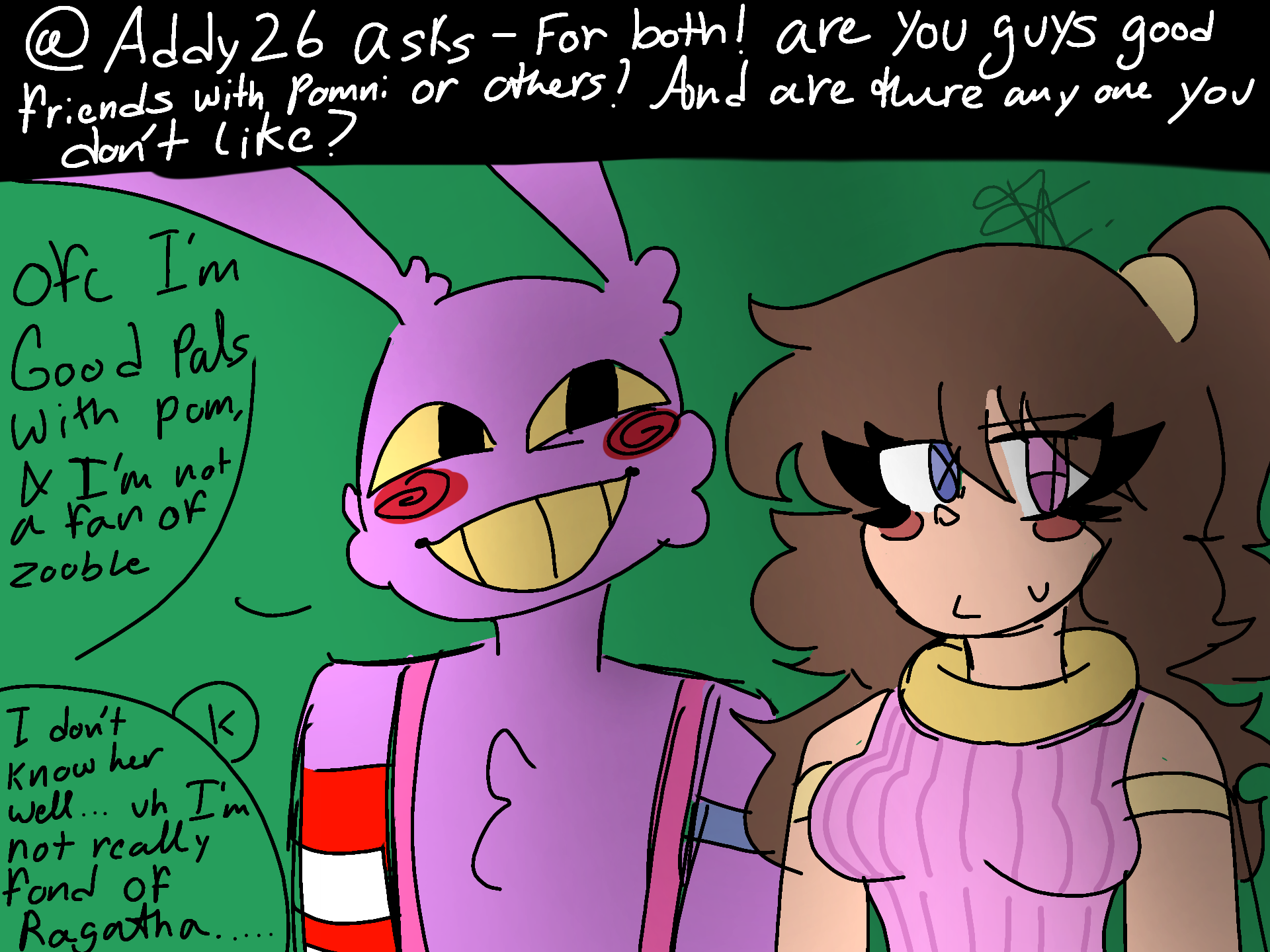 @Addy26 asked- For both! are you guys good friends with pomni or others? And are there anybody you guys don't like?