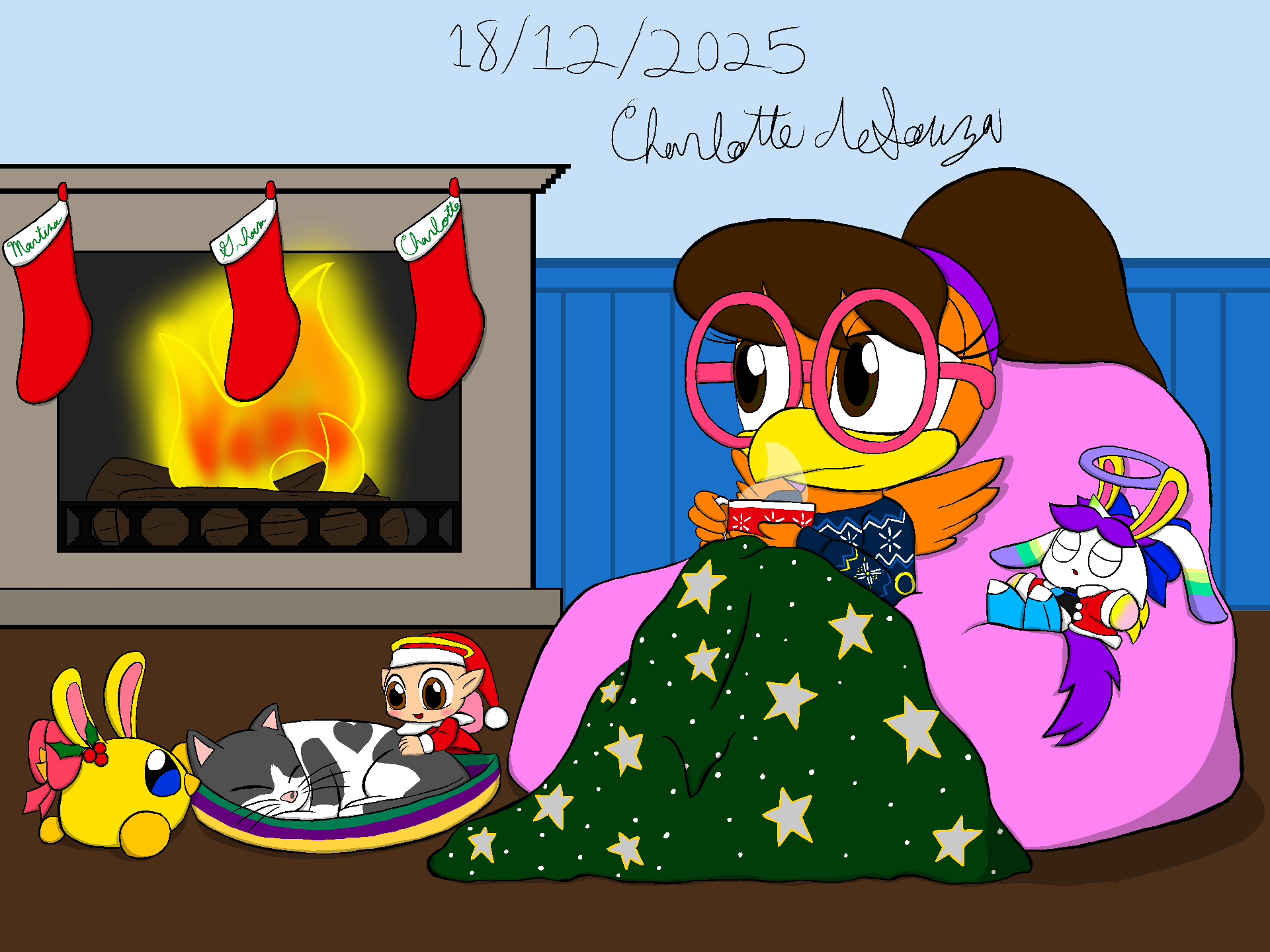 Just me enjoying a mug of hot chocolate, next to the fireplace, along with my little cuties: Chalulu (Hero-Swim Chao), Gnap (Nightopian), and Candy (Tim). Along with my ever cozy kitty Balan. #christmas2025