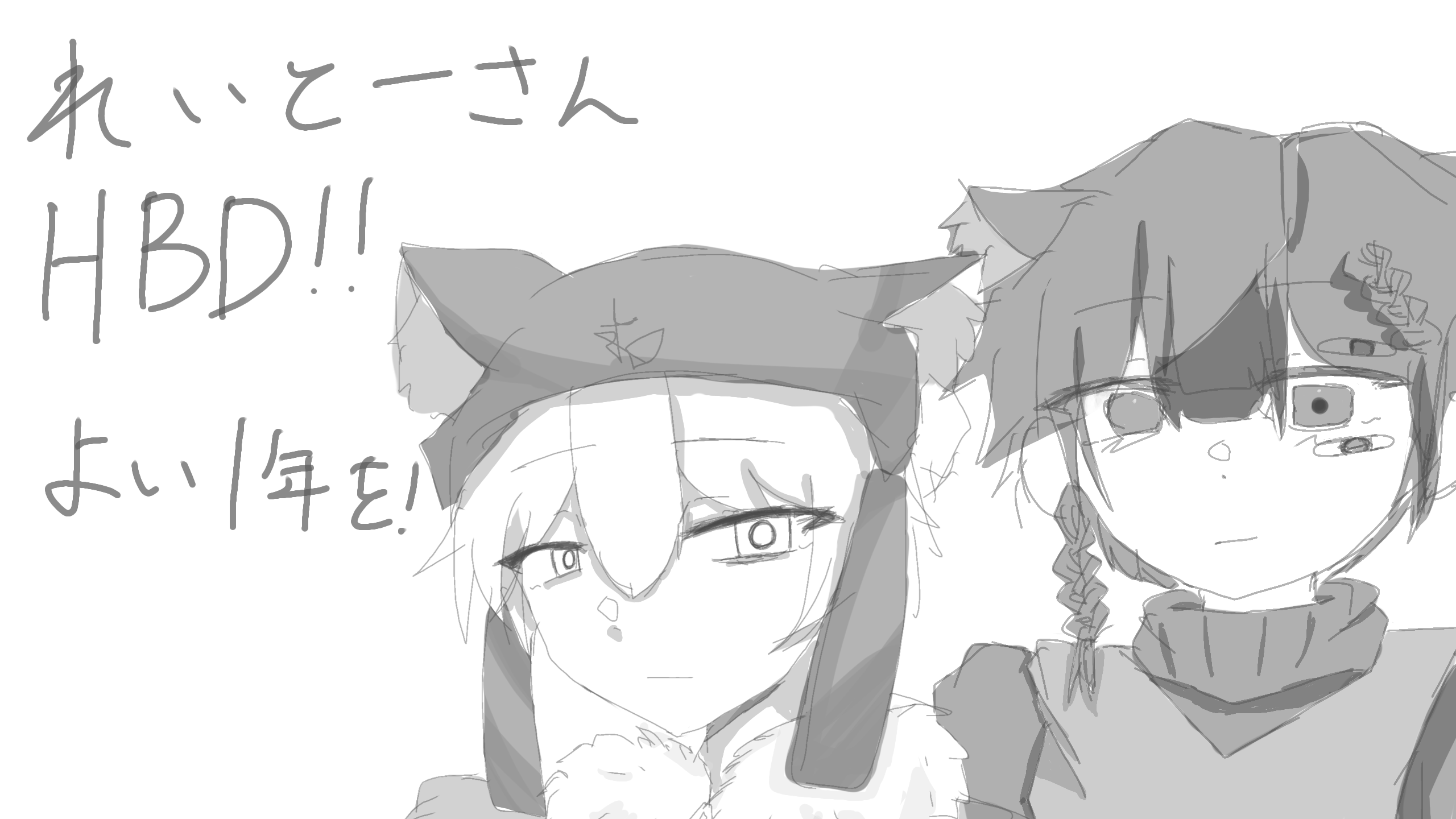 @utu-Ro_x ありがとう~!獣耳好きがばれた...でもれいとーさんの獣耳大好きだから描けてよかった!モノクロでごめんね!保存はもちろんOKだよ!あとタグとメンションの間に空白開けてみたから多分だいじょぶだと思う!改めてお誕生日おめでとう!