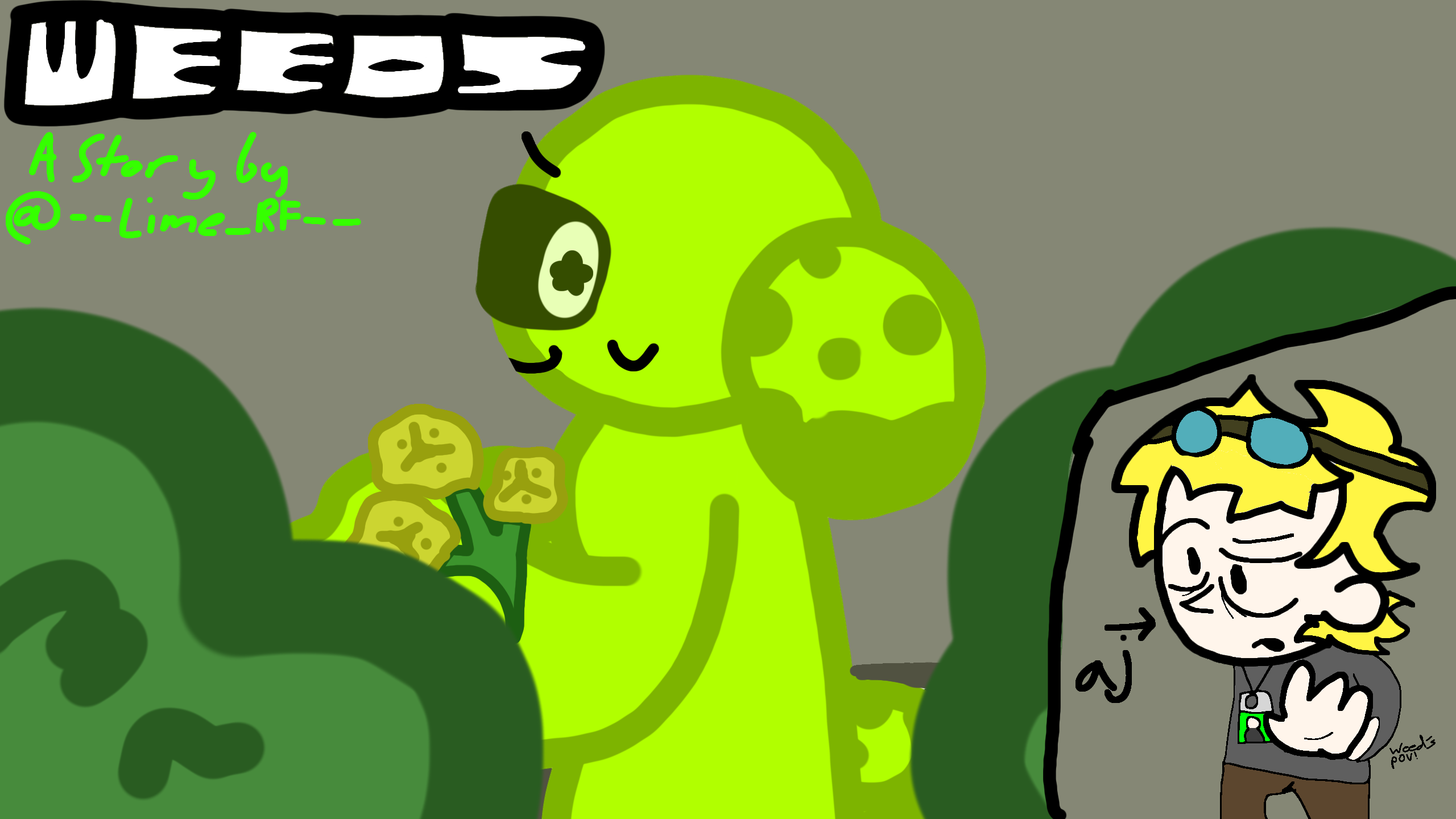 you're walking through a town, It looks abandoned, You hear some rusling behind a building you look to see a bright acid-green girl holding some yellow flower-like weeds, Will you go further or flee? The choice is yours...