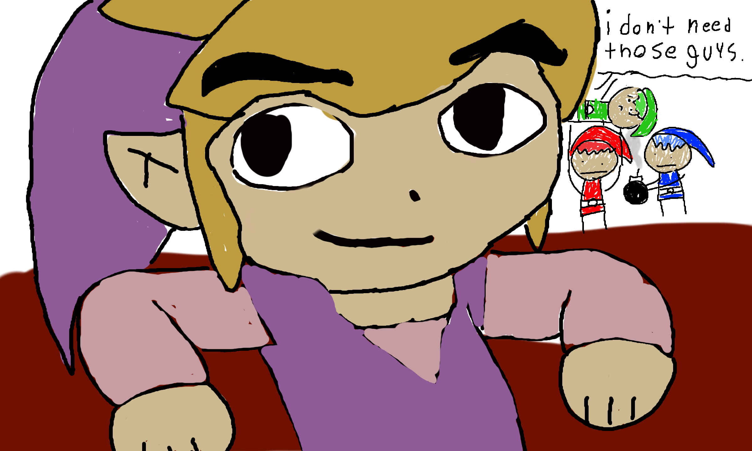 Purple Link doesn't need the rest of the Triforce Team, (after they left him.) but maybe he should help Green Link?