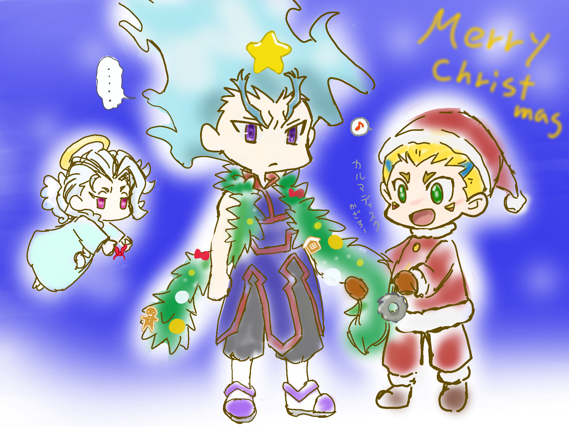 それは、ルイさんの誕生日とXmasイラストを別々に描いてUPしているのだから、多少遅刻しても(米国時間なら25日)メリークリスマス言っても大丈夫!…ワシなんかは致命傷な大遅刻かましておいて、平気に長文コメを送り付ける本物の駄目人間でゴザイマス↓↓されるがままの暴君、無邪気なドラム、天使なのか堕天使なのか分からない表情したロニジェル…ろに天?いや…ろに天は本当に天ぷらコスしているから間違わないッすよw背景は寒色使っているのに、なんだか温かい気持ちにさせてくれる3ショット見ながら、外で除雪車が作業している警告音や地響きを聞いていますw メリークリスマス(時間差が非道い)!