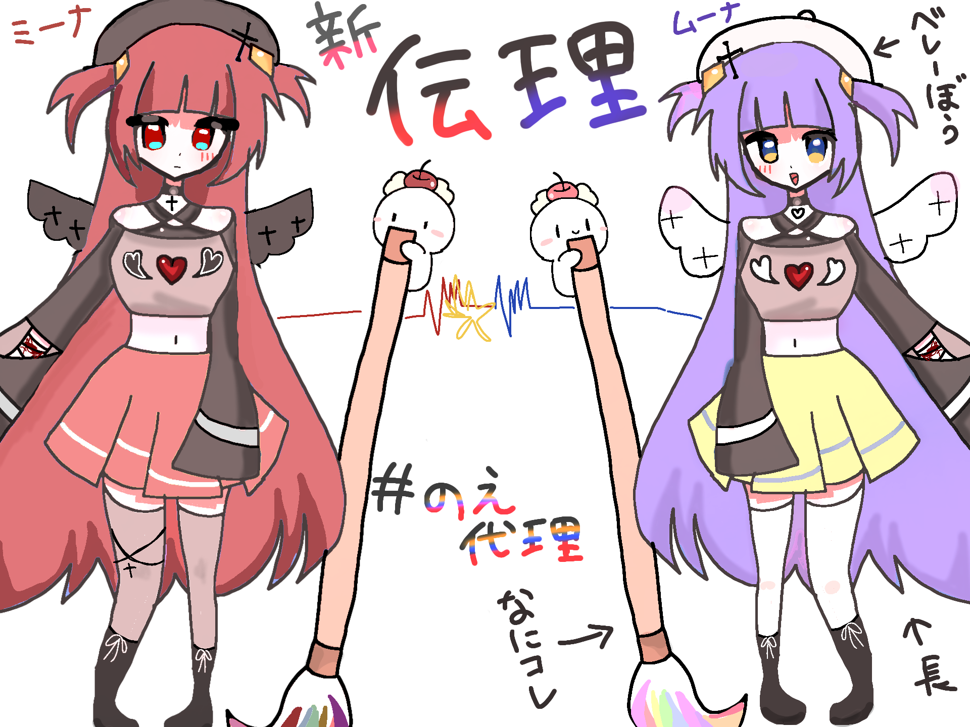 初めての代理ちゃんです…!右の子が、「ムーナ」で、左の子が「ミーナ」です!一応、魔女っ子設定です…見えないね。二人は姉妹関係です!ライバルでもあります!描いてくれると嬉しいです! #のえ代理皆さんはどちらが好きですか…??のえるは…ムーナです笑どちらも包帯してます…