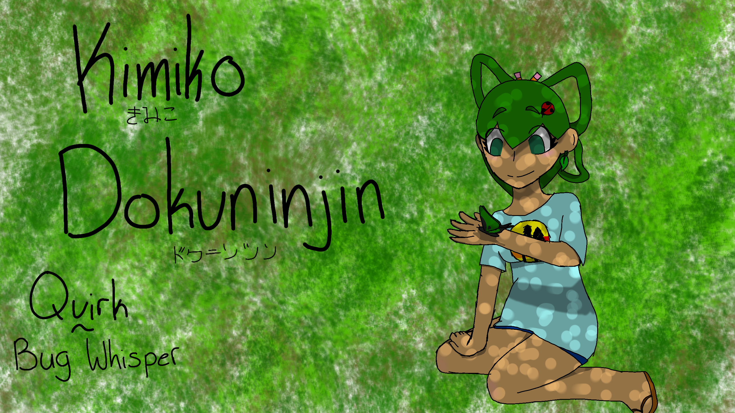 this is my mha oc! her quirk- Bug Whisper lets her control any insect within a half mile and she loves bugs. ungodly amount of info on ANY bug. she talks to Koda through insects he doesnt mind being around. super friendly and will be best friends with anyone as long as you dont hurt her bugs. hero name: Lady Bug
