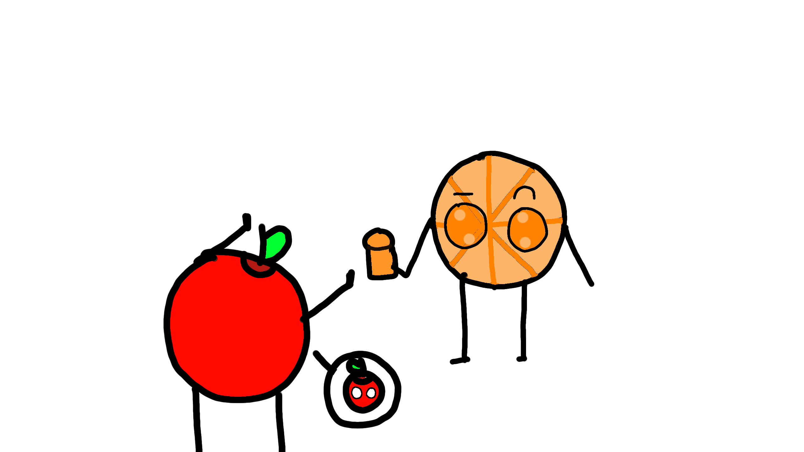 Apple Buddy: Orange, do not drink that!Orange Buddy: It's only orange juice-Apple Buddy: That's the problem!Orange Buddy: What is it made of?Apple Buddy: ...Just don't drink it!